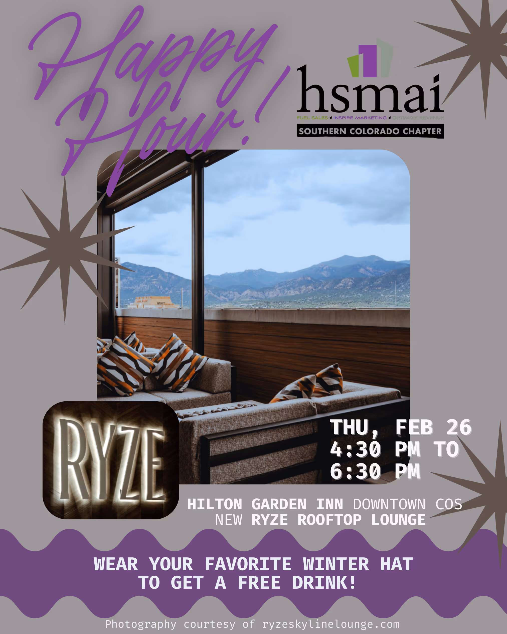 Take your networking to new heights at RYZE Skyline Lounge! Mix, mingle, and connect with Colorado Springs’ hospitality community while enjoying stunning skyline views, craft cocktails, and great conversation. Whether you’re building new relationships or catching up with familiar faces, this rooftop gathering is where business meets buzz.